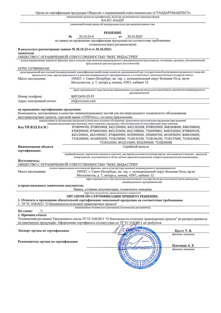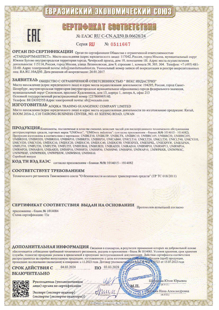 Confirming the guarantee of quality, reliability, and safety, UNIO parts undergo not only mandatory certification procedures but also regular random product inspections at all stages of production.